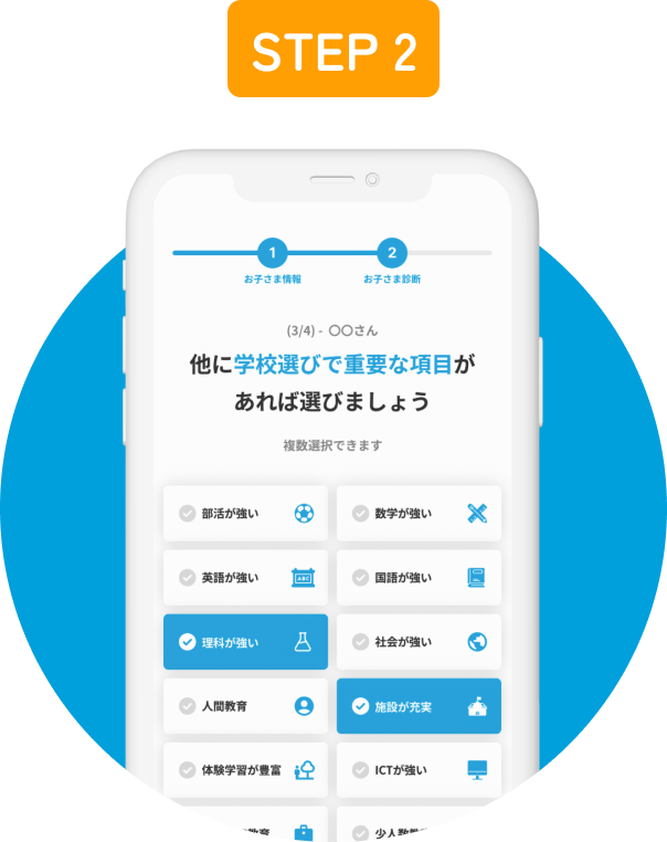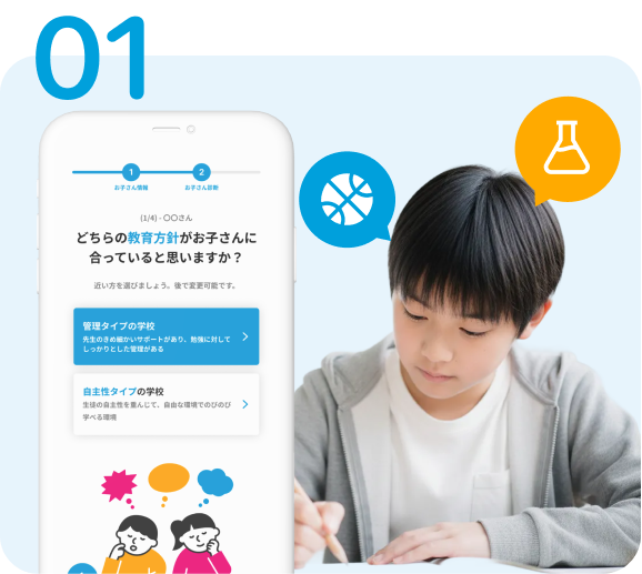 志望校選びに迷う親子のために、簡単な質問に答えるだけで、お子さまにピッタリの学校をおすすめします。