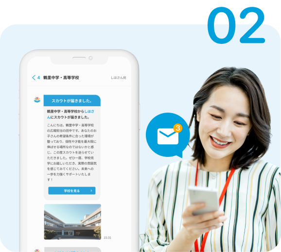 お子さまの特徴や希望を元に、興味を持った学校から直接説明会やオープンキャンパスの案内がメッセージが届きます。