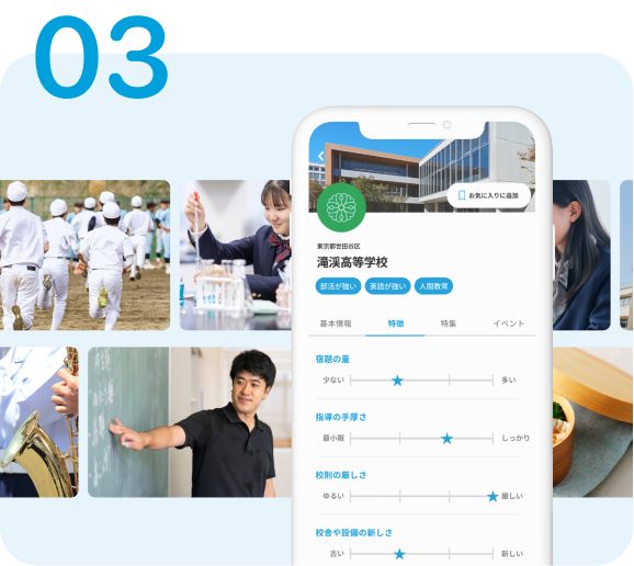 情報が多すぎて、どこから手をつけたらいいか分からなかった高校選び。スキマ時間に気になる学校をチェックできるのが助かります。