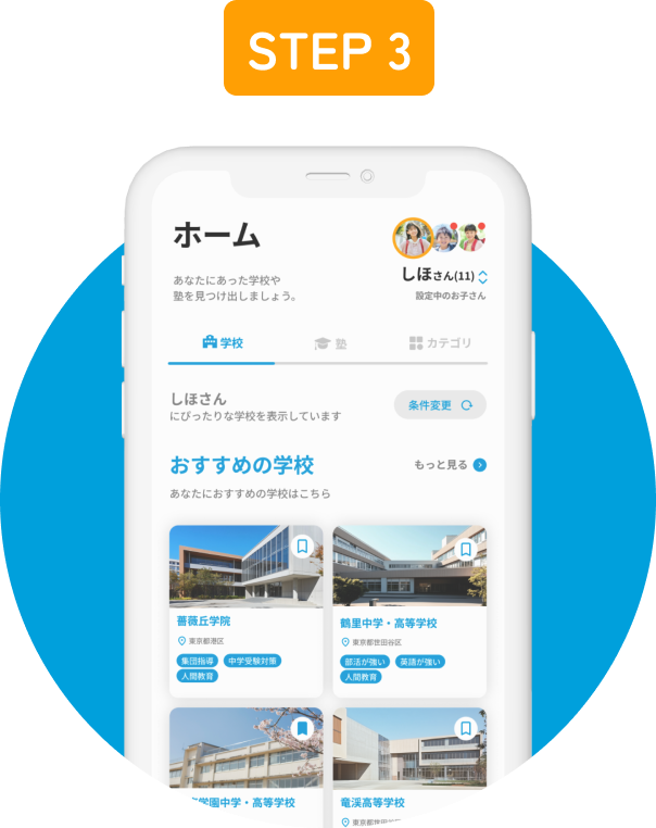 受験を考えている親子向けに、入力した情報からおすすめの学校をレコメンドしたり、興味を持った学校から直接説明会の案内が届きます。他にも様々な機能で学校との出会いを提供します。