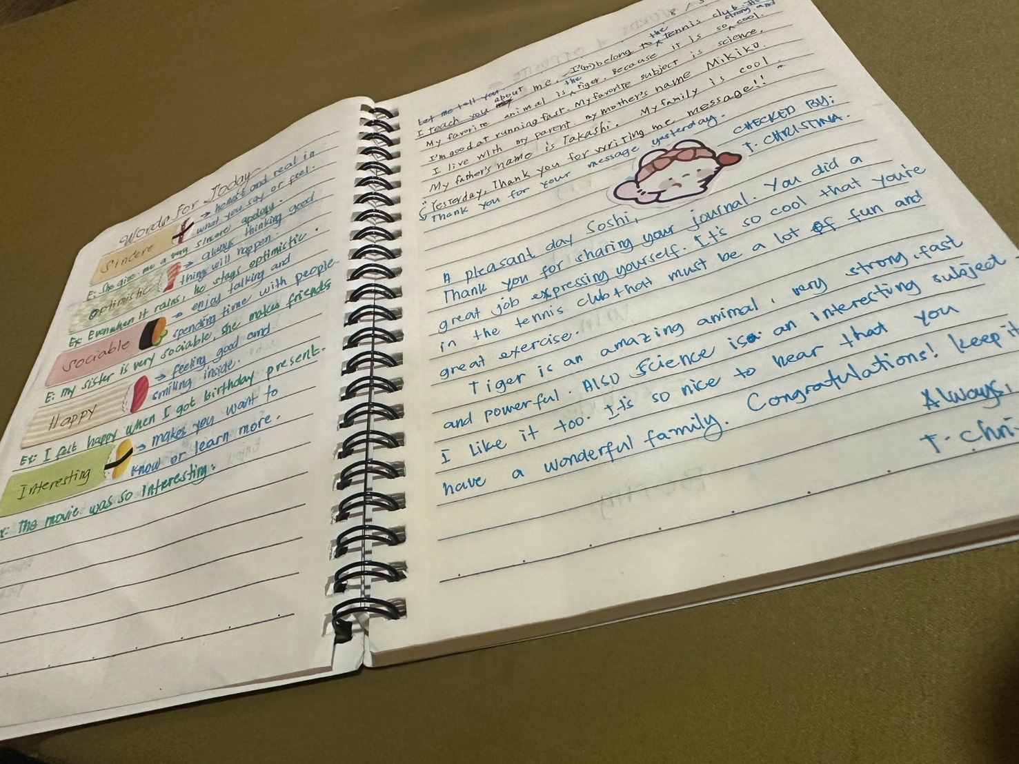 平山先生 2日目までは緊張や不安が見られましたが、授業が始まって逃げ場がなくなると、自然と英語に熱中していました。生活面でも自立的な行動が増え、積極性が高まりました。異学年同士の協力も生まれ、笑顔や真剣な表情が増えていきました。日々の英語日記からも、その成長ぶりがはっきりと読み取れます。