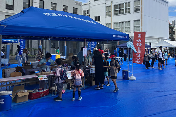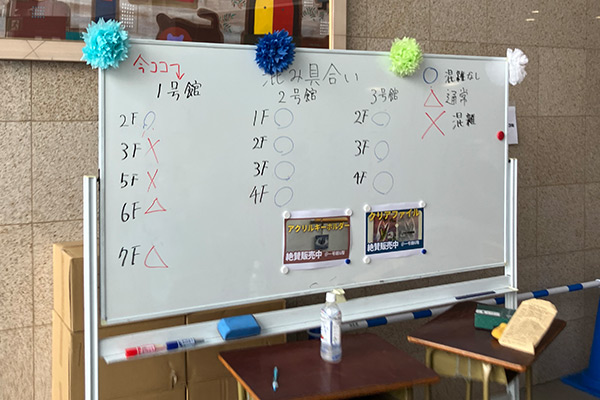 トイレは各階に設置され混雑も少なく、休憩スペースも充実。複数の教室が休憩所として解放されているほか、校庭一面に敷かれたブルーシートはまさに「憩いの場」。小さなお子さん連れにも、生徒が至る所で声を掛けてくれるなど安心できる対応が目立ちました。