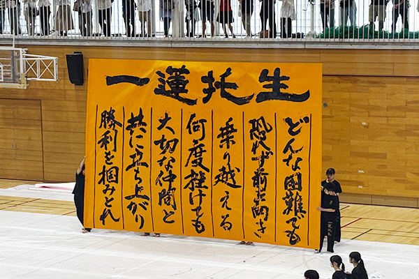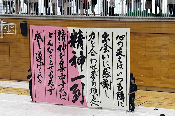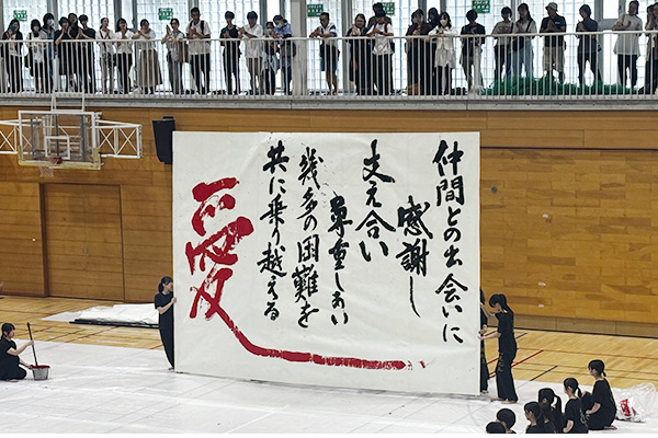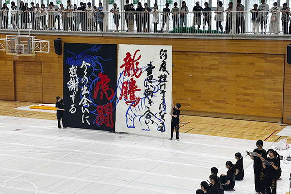 体育館では全国大会常連、数々の賞を受賞している書道部の迫力あるパフォーマンスが披露されました。観客は会場の上階から見学。部員たちの熱気が観客席にも伝わってきました。