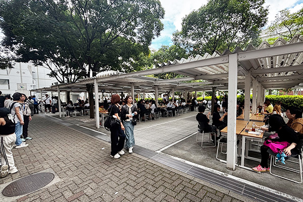校内には焼き鳥、焼きそば、たこ焼き、餃子、ハンバーガー、チュロス、タピオカミルクティーなど、バラエティ豊かな模擬店が並びました。いずれも1人前の分量ですが、13時頃には半分以上のお店が売り切れてしまう人気ぶり。ドリンクも模擬店で販売されており、昼食を楽しむ来場者の姿が目立ちました。